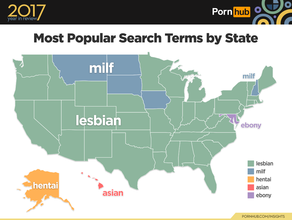 ‘Lesbian’ is the number one most popular searched term by almost all of the states, minus Montana, North Dakota, South Dakota and Iowa! These states and New Hampshire had MILF as their most searched term for the year. Alaska was more interested in ‘hentai’ (a genre of anime and manga pornography) in 2017, and visitors from Hawaii favored ‘asian’ as their top search.