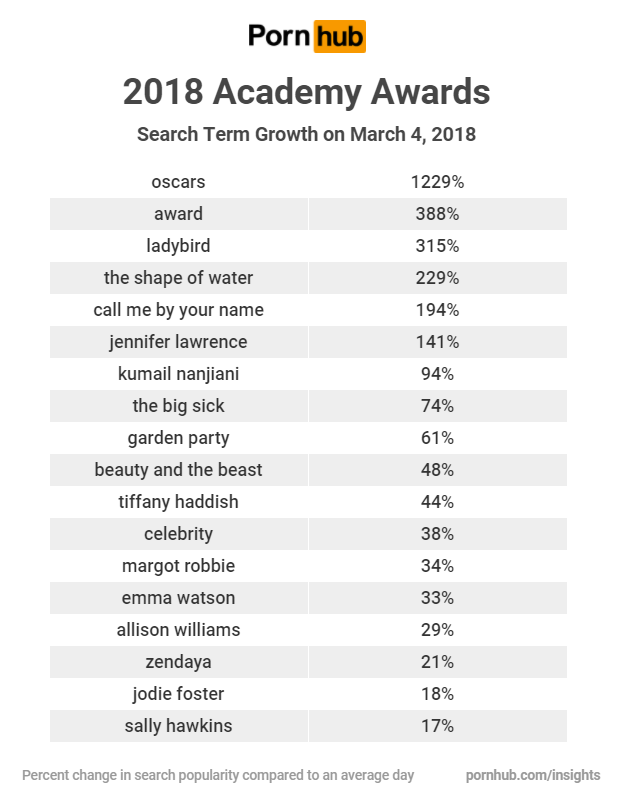 Compared to the weekly average, March 4th saw searches containing “oscars” increase by 1229% and “award” by 388%. Many of this year’s top Oscar nominated movies and celebrities saw search increases on March 4th. Even searches containing “celebrity”, one of Pornhub’s most popular search terms, increased by as much as 38%.