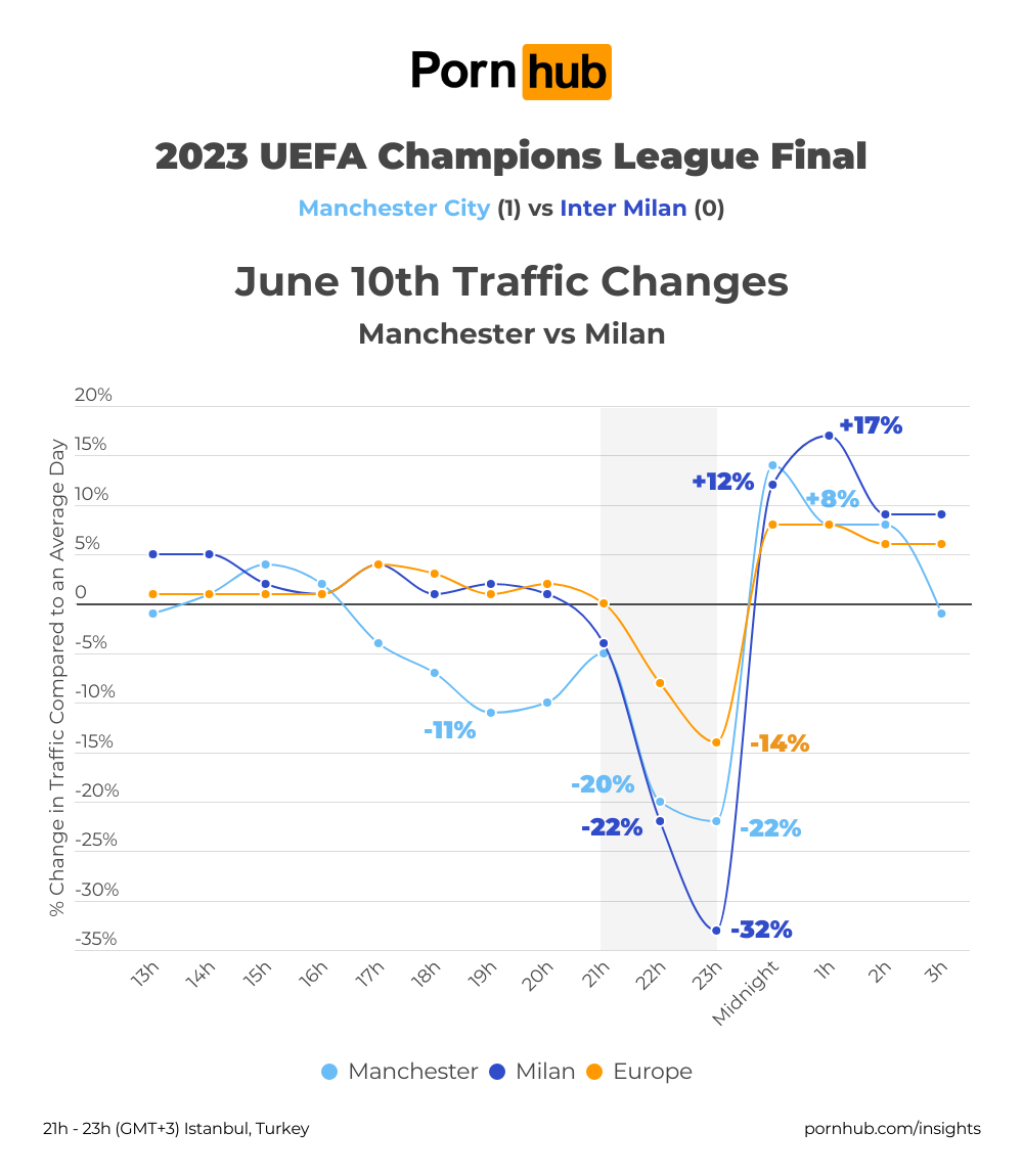 Interestingly enough, traffic in Manchester started dropping long before the 19:00 (GMT+3) mark. By 17:00 (GMT+3), traffic was already dropping to around -5%. It stayed that way until 20:00 (GMT+3), when a surge happened until 21:00 (GMT+3), and then began to plummet again.
