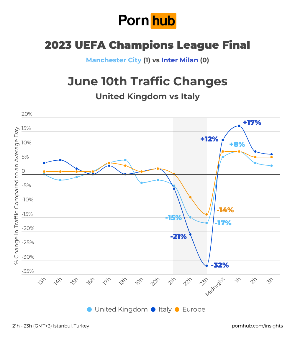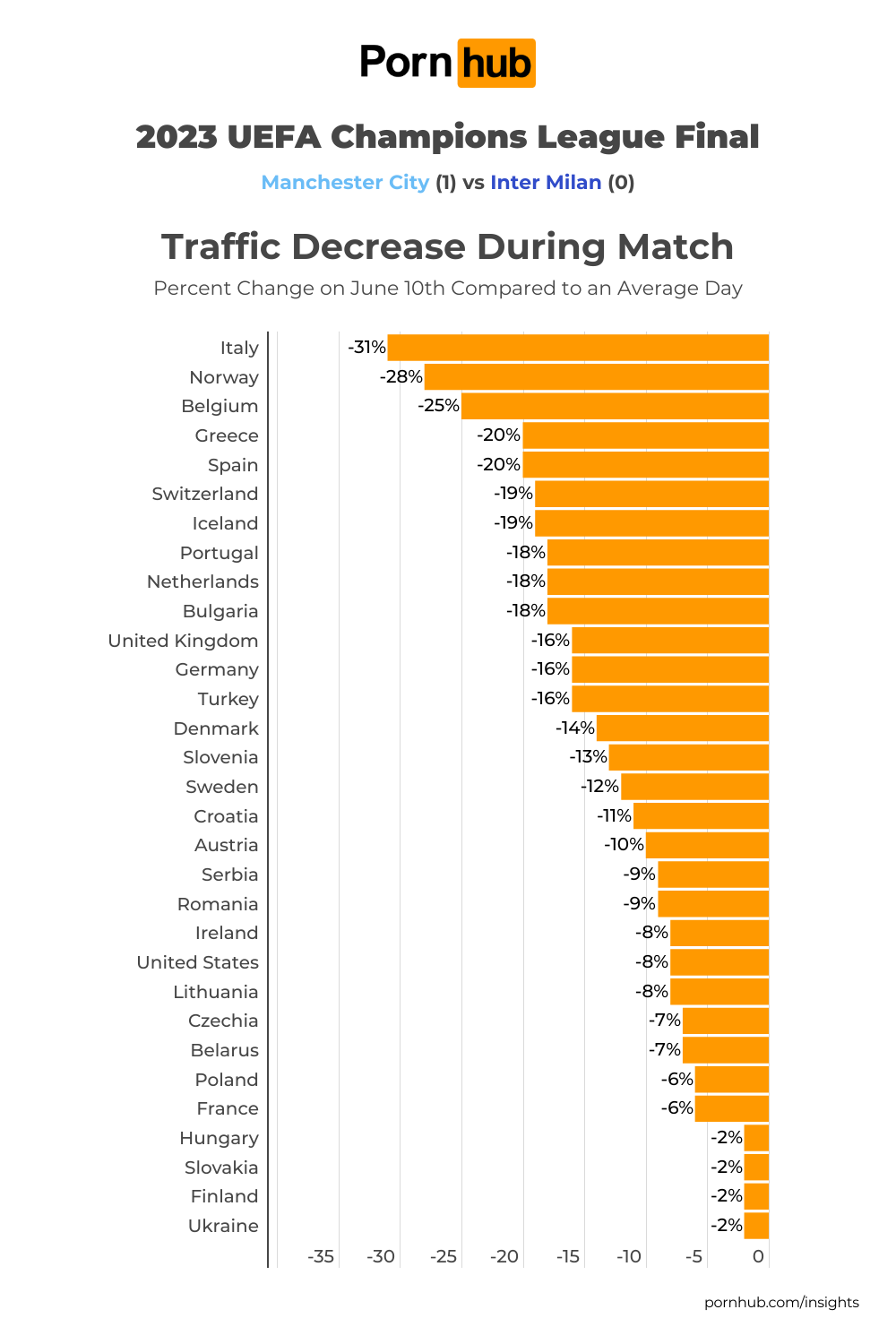Italy saw a massive decrease in traffic to Pornhub, almost double the amount of the competing team. During game time, Italy’s traffic was -31% below average, whereas The United Kingdom only dropped -16%.
