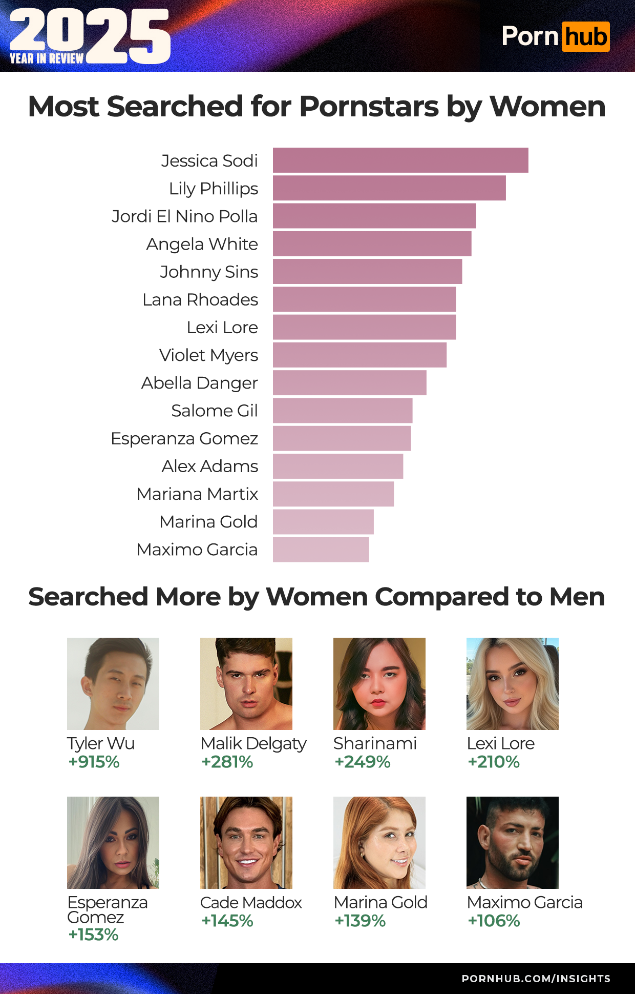 Explore our graphs and detailed summaries to discover how the world’s porn viewing habits unfolded in 2025. Whether you browse from start to finish or jump between the sections linked below, you’ll uncover how the gender gap influences interests, which states and countries have distinct preferences, the destinations that came to Pornhub most, the video game characters sparking new fantasies, and plenty of other surprises!