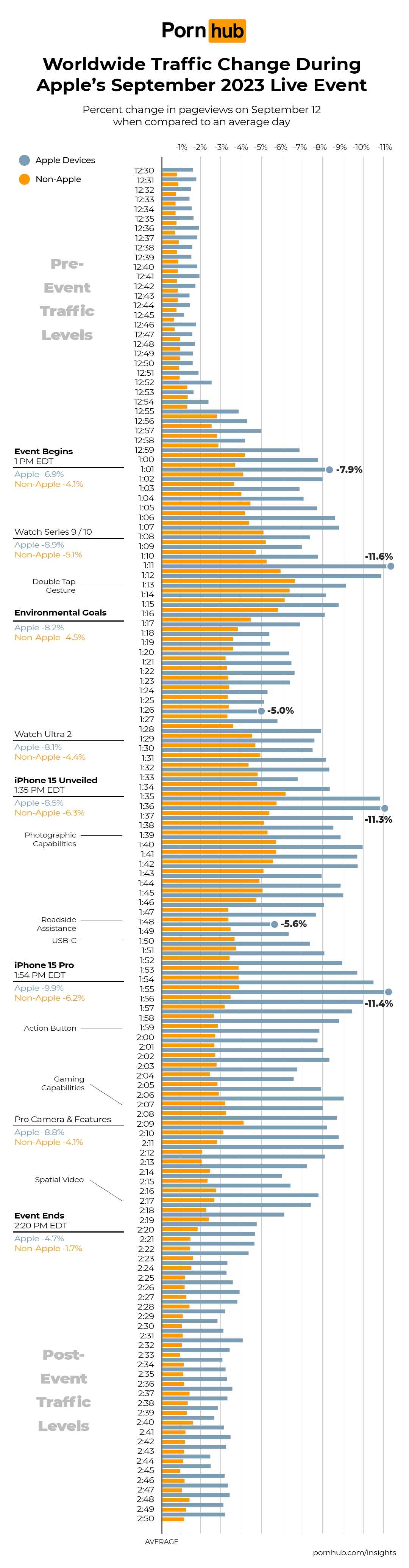 Apple users seemed least interested in the environmental goals presented during the stream. During this segment, traffic was at –5%. Additionally, the roadside assistance segment also proved unpopular, as traffic to Pornhub was at –5.6%.