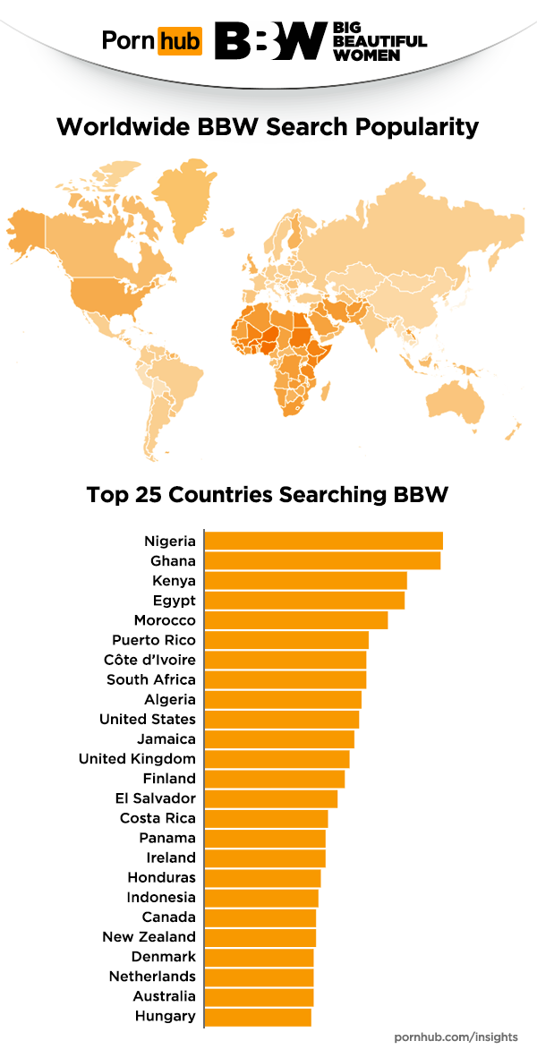 Worldwide, it’s still countries from the African continent that proportionately search the most for BBW videos. Nigeria takes the top spot followed by Ghana, Kenya and Egypt. The United States comes in at 10th for popularity, the United Kingdom at 12th and Canada 20th.