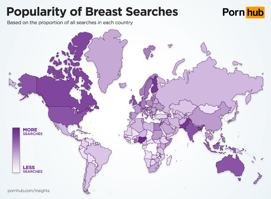 Finally, let’s take a look at the countries which are more or less interested in breasts, and what types they prefer. The country that proportionately searches the most often for breasts is Nigeria, followed by Finland, Canada, United Kingdom and the United States. Breast related searches are least common in Peru, Brazil, Argentina, Chile, Mexico, Algeria and Russia.