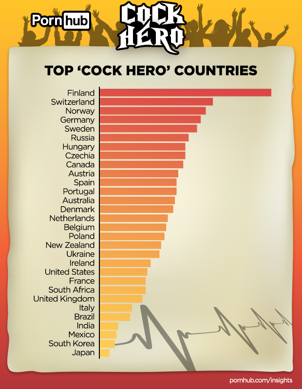 Visitors from Finland are by far the most likely to search for “cock hero” videos, followed by visitors from Switzerland, Norway, Germany and Sweden. Canada ranks 9th, Australia 13th and the United States 21st.