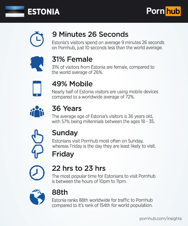 It’s been a few years since we took an in depth look at the porn habit’s of Estonia, so Ohtuleht.ee got in touch with us for a 2017 update. Although the country of Estonia ranks 88th for worldwide traffic to Pornhub, that’s far ahead of their population rank of 154th. Estonians spend on average 9 minutes 26 seconds on Pornhub, which is 10 seconds longer than the worldwide average. 31% of visitors are women, which is significantly higher than the 26% worldwide.