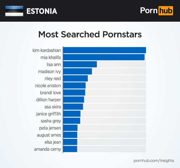 As in most of the world, Kim Kardashian is the most searched for pornstar in Estonia, narrowly beating out Mia Khalifa.