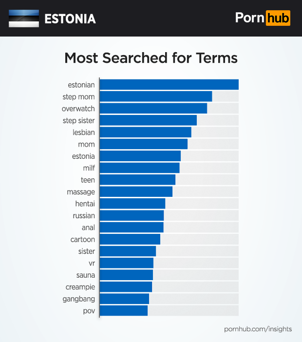 As in many countries like Norway, Scotland and Argentina, Estonians like to search most often for videos featuring their fellow citizens, with “estonian” being the number one search term, and “estonia” taking 7th place. Other popular searches include “step mom”, “lesbian” and “mom”. Searches for the video game “overwatch” rank third, following the worldwide trend we discovered in our 2016 Year in Review.