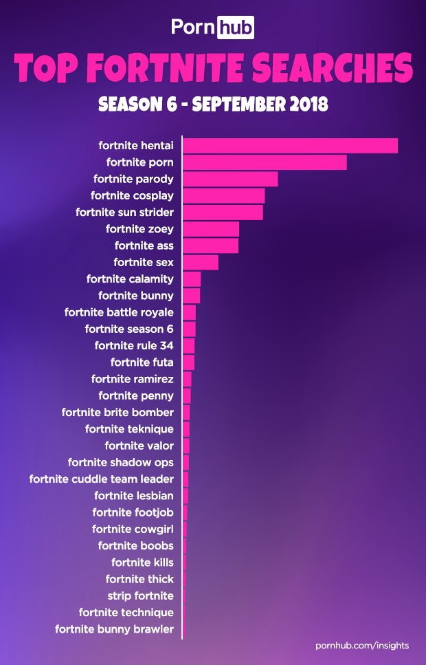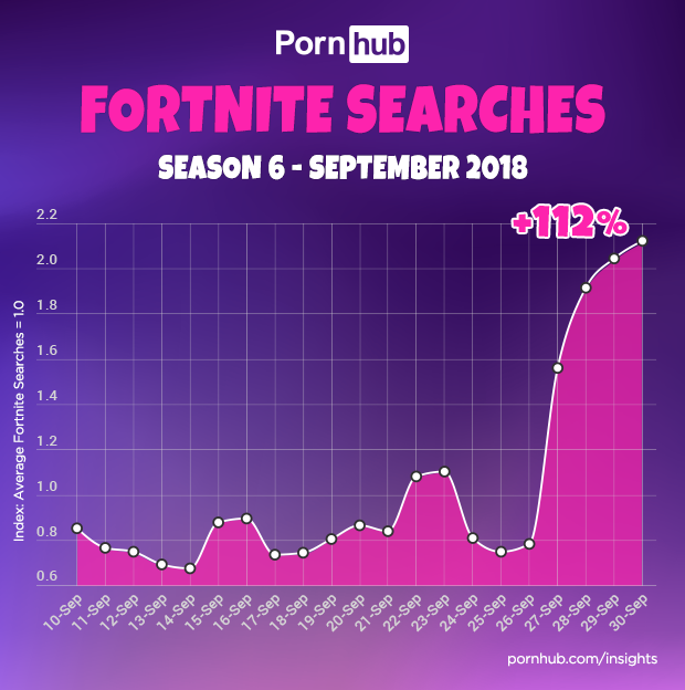 Fortnite Season 6 has arrived, and just like Season 5, it has Pornhub visitors very excited. Forbes asked Pornhub’s statisticians to dig deeper into the data. Following the launch, searches containing Fortnite more than doubled on Pornhub. And seeing as Fortnite has remained in Pornhub’s Top 25 search terms through most of 2018, that equates to hundreds of thousands of additional searches per day.