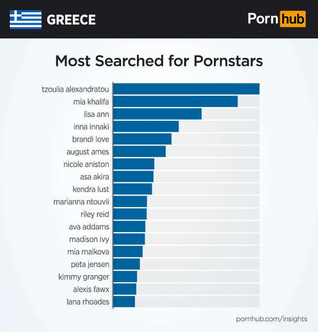 The most searched for pornstar in Greece is Tzoulia Alexandratou, who herself is Greek. Other Greek pornstars are popular including Inna Innaki and Marianna Ntouvli.