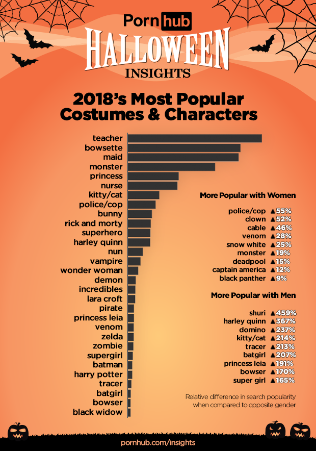 Halloween has become a tradition on the Pornhub Insights blog with holiday data released in 2015, 2016, 2017 and now 2018. This year we’re going to kick things off with the most helpful of spooky Insights; the costumes and characters that are presently being searched most often on Pornhub. So if you’re heading out to a Halloween party, these are the sexy costumes most likely to get you noticed.