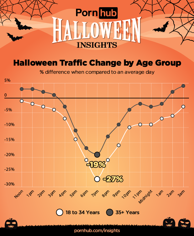 With so many people living out their true fantasies on Halloween, that leaves less people to do their fantasizing on Pornhub. Across the United States, traffic to Pornhub begins to drop around 5pm and hits it’s lowest point around 7pm. Traffic from Millennials aged 18-34 drops by as much as -27% compared to an average day, while traffic from visitors over the age of 35 is down a still-impressive -19%.
