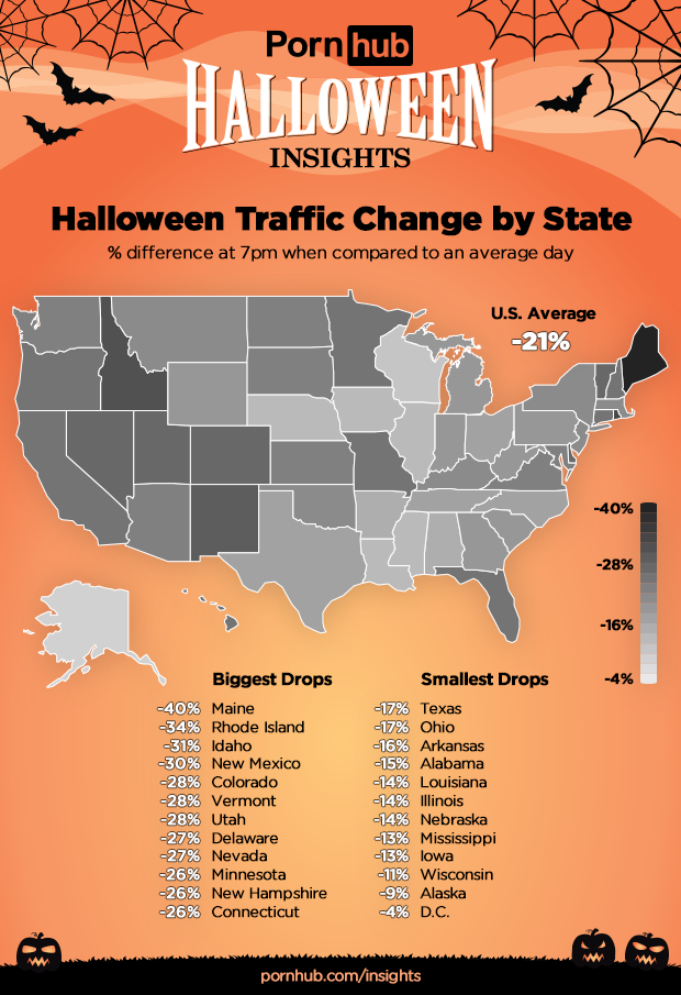 The average 7pm traffic drop across the United States was -21%, but some states are much more likely to give up Pornhub in favor of Halloween. Our statisticians recorded a -40% drop in traffic from Maine, -34% in Rhode Island and -31% in Idaho. The traffic drop was smallest in D.C. at only -4% compared to an average day. (Results have been adjusted for each time zone).