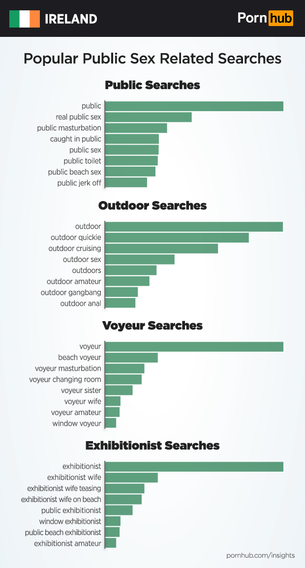 Public sex is a fantasy for many people, and while few may partake in such action, it’s a popular searches genre on Pornhub. Public sex fantasies may involve having sex as an exhibitionist, or the chance of being seen by voyeur types. Our friends at Stellar Magazine reached out to see how Ireland stacks up against the world when it comes to getting it on in public.