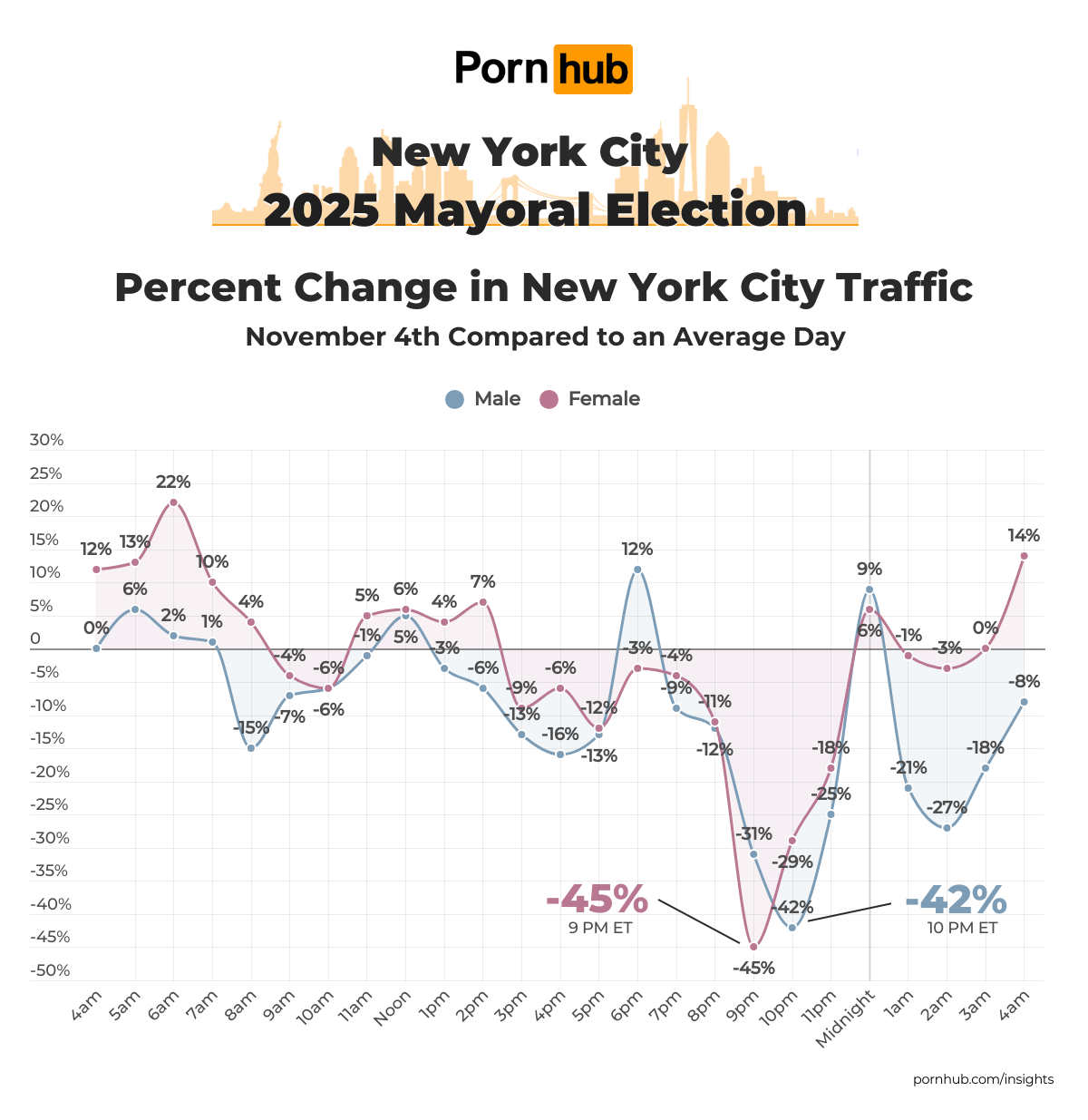 As one of our most active cities in the US, an election like this has a substantial effect on visits to Pornhub. So, when our friends at The New York Post asked our statisticians to pull some data, they were eager to analyze it and see what impact the action had on New Yorker’s browsing habits!