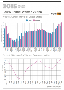 Some of our favorite Insights posts to date out have focused on gender demographics which we are able to compile and study thanks to anonymized data from our web analytics tool. It’s very interesting to study the different ways that men and women use and interact with the site. Up next we’ve got the latest on how the ladies get down with Pornhub. As we mentioned a little earlier on, our female viewer base has grown over the course of the last year. In 2014’s year in review, we reported that 23% of our visitors were from members of the fairer sex, and we are now up to 24% at the end of 2015. Well done ladies! Dr. Laurie believes that “this number will likely keep increasing as more and more women are feeling empowered about their sexuality and experience less shame in liking sex. More and more women are also more open about masturbation (doing it and talking about it!)”