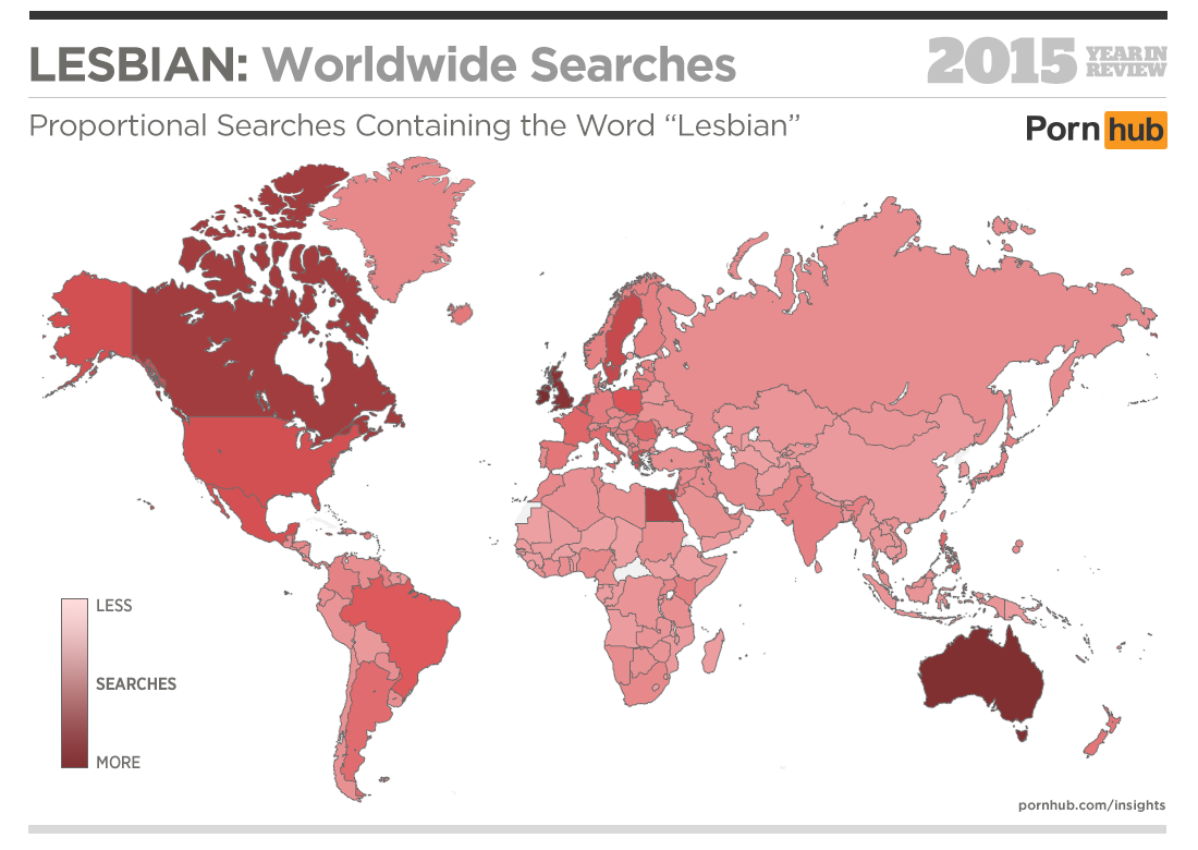 And now for a look at what was searched for the most on Pornhub over the course of the last 12 months. In 2015 ‘lesbian’ was the most searched term on the site. Lady-on-lady loving is also the type of content that happens to be the most popular among our female viewers and as we’ll see a little later on in our coverage, our female viewership has also grown over the course of the past year. This may be what finally pushed ‘lesbian’ into the number one spot. “Research by Dr. Meredith Chivers of Queens University has shown that women are aroused by all kinds of sexual activity/imagery, whether they are gay or straight, while straight men are usually not aroused by gay porn and gay men generally not aroused by straight porn,” notes Dr. Laurie. “It could be that the sexual acts they see on lesbian porn is what they favor (mostly cunnilingus), or simply that they get aroused to such a variety of imagery that it is difficult to pinpoint true desires versus what their bodies respond to.” Other big gaining search terms this year were ‘black’ with a 16 rank placement jump and ‘celebrity sex tape’ with a 47 place jump. Family favorite ‘step mom and son’ jumped an astonishing 71 places, making it the 15th most searched term on Pornhub, in the world. Dr. Laurie suggests that “taboo acts will always rank high simply because it’s taboo. It’s also only in fantasy and it usually stays there, as compared to threesomes which are often desired in real life for example.”
