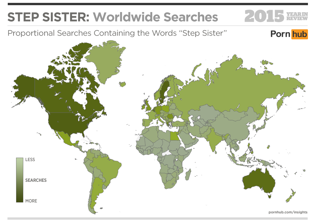 Down under in Australia searches for step relatives are all the rage. ‘Step mom’ and ‘step sister’ land in at the number 2 and number 8 spots for most searched terms in the country, both with some impressive gains over last year. Similarly, the top gaining searches here are ‘step mom shower’ with a 310% increase and ‘step sister caught’ with a 283% growth in searches since 2014.