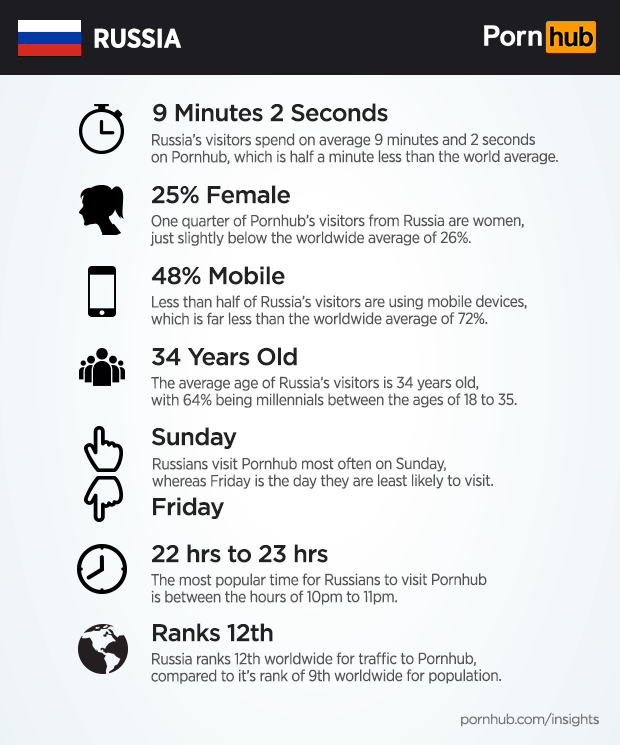 Less than half of Russia’s visitors are using mobile devices including tablets and smartphones. That’s far less that the world average of 72%, meaning that more Russians are still using desktop computers to visit Pornhub. The average age of Russian visitors is 34 years old, with 64% being millennials between the ages of 18 and 35. Russians most often visit Pornhub between the hours of 10pm and 11pm, with Sunday being the most popular day.