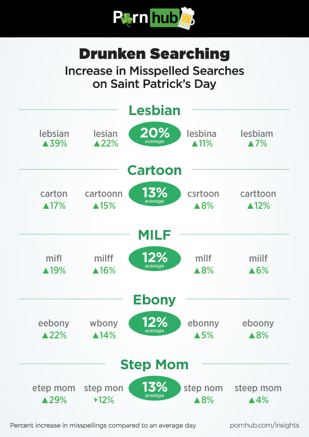 Misspellings aren’t that uncommon, especially when users tend to navigate our site with only one hand — but we do find a particular increase in misspelled terms on Saint Patrick’s Day. On average, “Lesbian” misspellings increase by 20%, especially those of the “lebsian” variety. Cartoon is mistaken for “carton” 17% more than normal, MILF becomes “mifl” 19% more often, and Step Mom is searched 29% more often as “etep mom”.