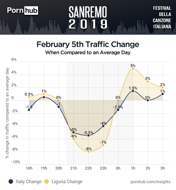 Our statisticians discovered that compared to an average day, Italy’s traffic started to drop shortly after 7 p.m., probably because people were starting to prepare for the live show.