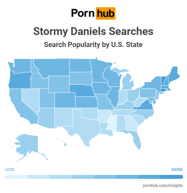 If we average the searches so far in 2018, we can see which states are proportionately more interested in Stormy Daniels. Eastern states like Vermont, Connecticut, New Hampshire, Virginia, Massachusetts and D.C. are the most interested Stormy searches. The states where Stormy Daniels represents a smaller portion of total searches include Alabama, Nevada, Hawaii, Arkansas, Georgia and Mississippi.