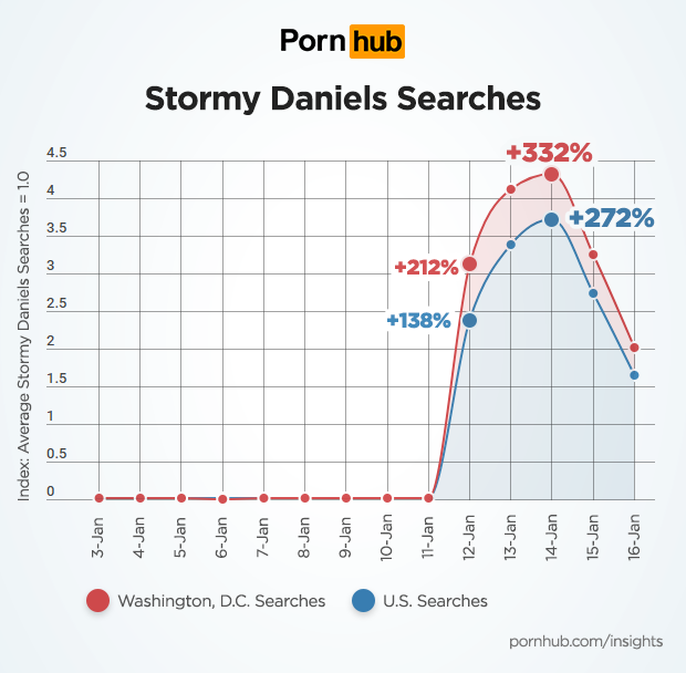AVN Hall of Fame pornstar Stormy Daniels (nsfw) has appeared in adult videos since the early 2000s, but recently shot to the forefront of public attention when her back-door dealings with U.S. President Trump were revealed.  Newsweek contacted us to see how the story may have affected searches on Pornhub.  Our analytics data revealed that Stormy’s story sent millions of curious visitors to Pornhub, where searches containing “Stormy Daniels” increased from a daily average of 2500 to more than 2 million searches in just 5 days.  Worldwide searches peaked at 375% above the 2 week average on January 14th.