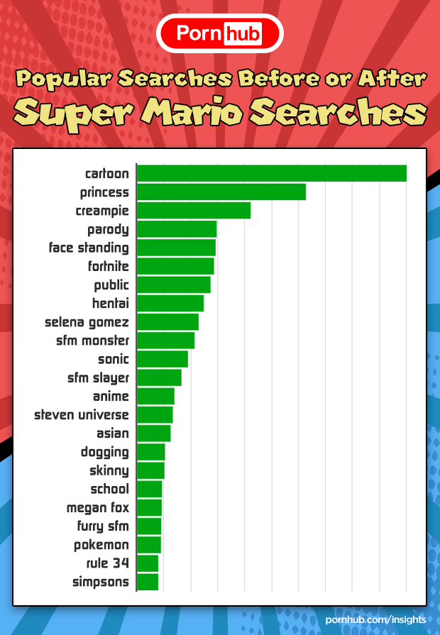Pornhub’s statisticians sorted through months of search data to see what Super Mario related searches were most popular. The results showed that “Mario” just edged out “Princess Peach” and that “Bowsette” still remains popular nearly two years after going viral as a hypothetical fan-art creation.