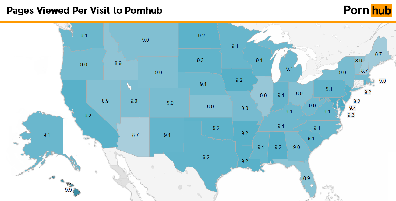 With over a million free videos to watch, and thousands added per day, Pornhub has something for everyone. But some states take a bit more time deciding what video works best. Aloha Hawaii! You’re back again at the top of our list. Hawaiians look at 9.93 pages each time they visit Pornhub, well ahead of the nation’s average of 9.05 pages.