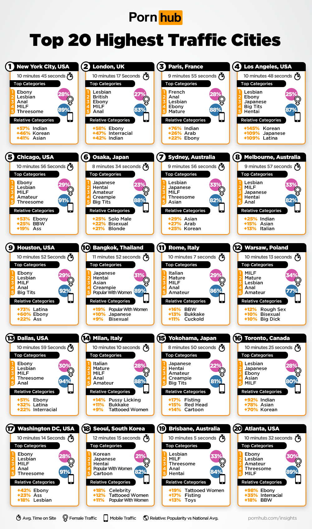 New York City tops Pornhub’s traffic list, even though worldwide it’s population of 8.5 million only ranks around 26th. It’s followed by London in second place, which has a similar population to New York of 8.1 million. Paris comes in third, but with a population of only 2.1 million that means the city’s residents are a horny bunch of regular porn watchers. Let’s be honest though, the Eiffel tower is a pretty big phallic symbol reminding residents it’s time to visit Pornhub.